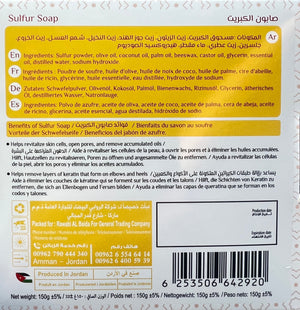 صابون طبيعي عالي الجودة مصنوع من مسحوق الكبريت النقي مع مزيج من زيت الزيتون، وزيت جوز الهند، وشمع العسل، وزيت الخروع لتجديد خلايا البشرة وتنظيف المسام بعمق.